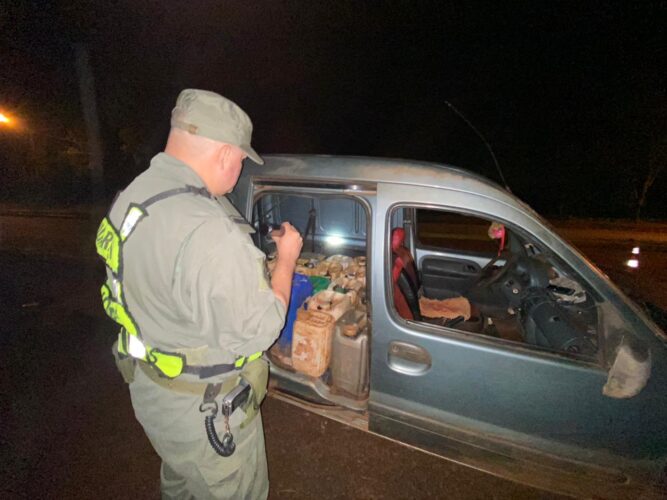 Asimismo, efectivos del Grupo de Seguridad Vial “Uruguai” perteneciente al Escuadrón 13 “Iguazú” detuvieron la marcha de un rodado con dominio de la República del Paraguay y, hallaron bidones y botellas de gaseosas que contenían 60 litros de gasoil.