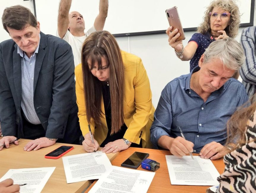 El ministro de Educación de la provincia, Miguel Sedoff y los gremios docentes oficialistas, entre ellos UDPM, UDA y SEMAB, firmaron este lunes un acuerdo salarial para un aumento al básico de poco más de tres mil pesos. Paralelamente, los sectores disidentes llevan adelante un paro de 48 horas con marchas y protestas. En horas del mediodía tomaron el Consejo General de Educación.