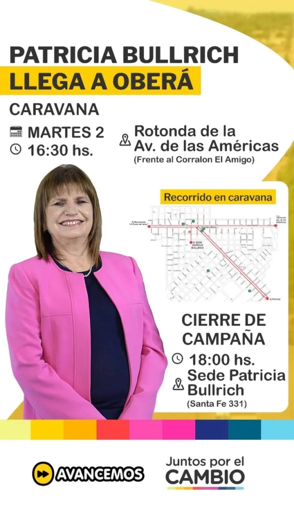 La ex ministra de Seguridad de la Nación, y precandidata a Presidente, Patricia Bullrich visitará Oberá el martes, donde participará de una caravana por la ciudad, en el cierre de campaña de Juntos por el Cambio.