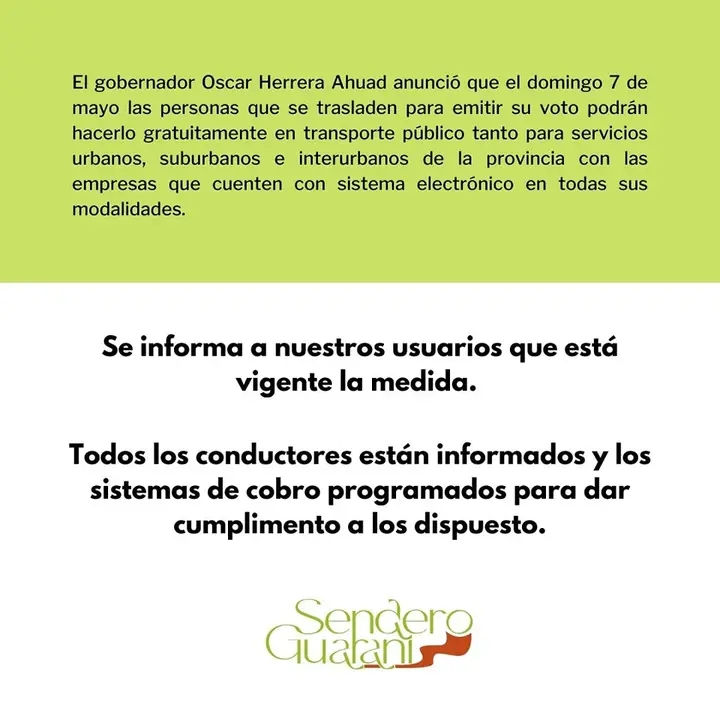La empresa Next (Sendero Guaraní) que presta el servicio urbano de pasajeros en Oberá, pidió a los usuarios denunciar si algún chófer no cumple con el boleto sin cargo este domingo de elecciones.