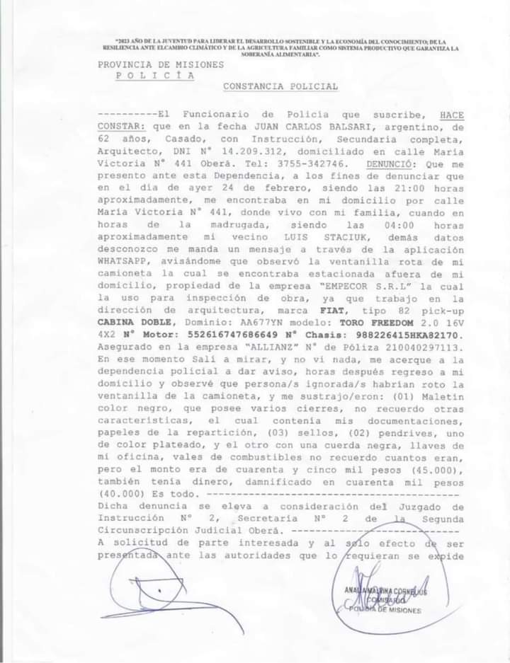 Según la denuncia, el hecho ocurrió el 24 de febrero pasado en su domicilio de calle María Victoria 441 cuando su vecino le avisó que la ventanilla la camioneta marca Fiat Toro propiedad de la empresa EMPECOR, estaba rota. Dentro de la misma había un maletín con vales de combustible por 45 mil pesos y dinero en efectivo por 40 mil pesos.