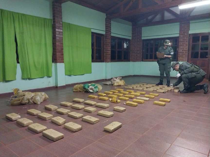Ante tal situación, y luego de realizar una búsqueda por el lugar circundante, logran hallar 3 bultos de grandes dimensiones envueltos en plástico, que a su vez contenían 64 paquetes rectangulares envueltos en cinta.