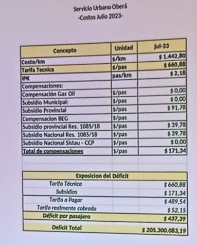 Según explicó, el costo por kilómetro del servicio es de 1.442 pesos, mientras que la tarifa técnica es de 660 pesos por pasajero. También afirmó que los subsidios que reciben equivalen a 171 pesos, asegurando que las empresas perciben un promedio de 52 pesos por usuario mediante el pago del boleto (70 pesos el único sin tarjeta), por lo que pierden 437 pesos por pasajero transportado en Oberá, aseveró.