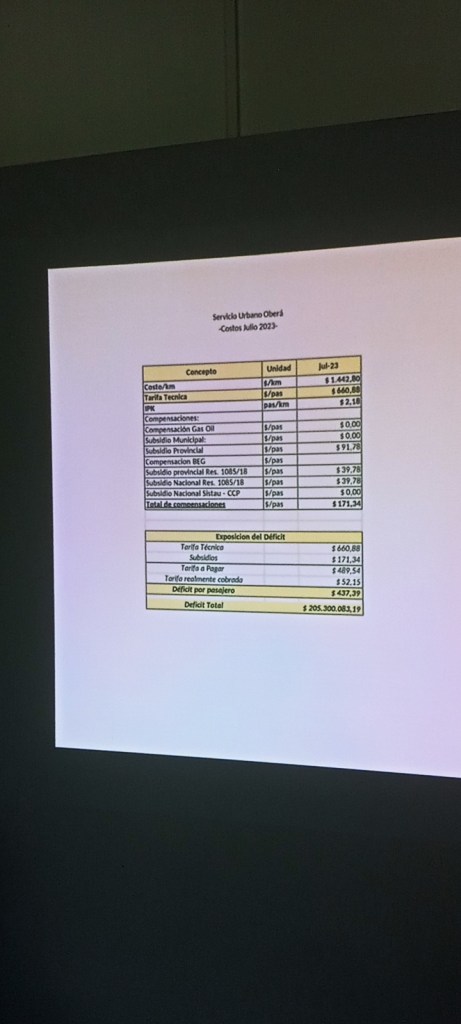 Según explicó, el costo por kilómetro del servicio es de 1.442 pesos, mientras que la tarifa técnica es de 660 pesos por pasajero. También afirmó que los subsidios que reciben equivalen a 171 pesos, asegurando que las empresas perciben un promedio de 52 pesos por usuario mediante el pago del boleto (70 pesos el único sin tarjeta), por lo que pierden 437 pesos por pasajero transportado en Oberá, aseveró.