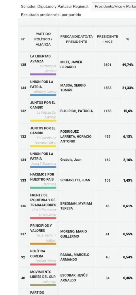Según el escrutinio provisorio, con el 100% de las mesas cargadas, Milei obtuvo el 45% de los votos. Muy atrás quedó el oficialismo encabezado por Sergio Massa con 27%, apoyado por el frente Renovador de la Concordia, como así también el frente opositor de Juntos por el Cambio con el 17% de Patricia Bullrich y Horacio Rodríguez Larreta.