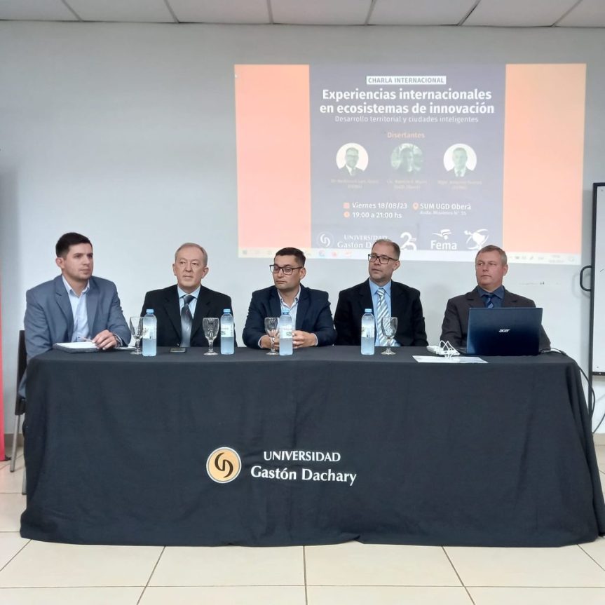 Participaron como disertantes, el Director de Vinculación y Desarrollo Económico, David Da Luz; el Delegado Rectoral, Benigno Romano; el coordinador de la carrera de Ciencias Económicas, Cont. Emmanuel Wekwert; el responsable local del proyecto de internacionalización, Horacio Horot; el docente, Ramiro Marín; el Presidente de la CRIPCO, Ernesto Seewald; el Director de FEMA, Antonio Termes; y el docente, Nedisson Gessi.