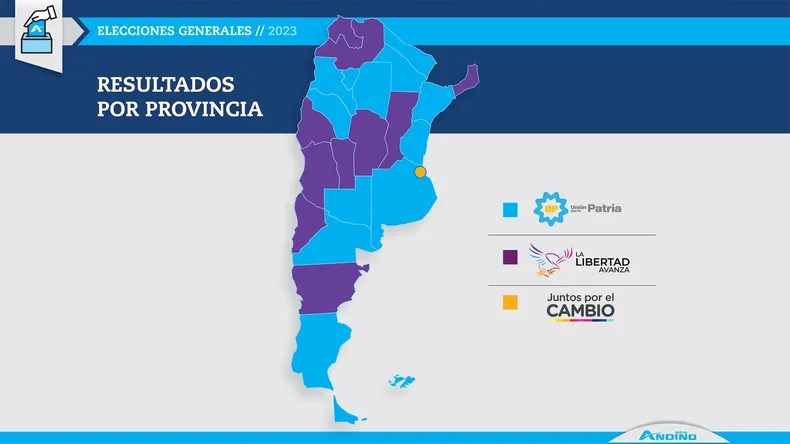 Massa logró pintar de celeste las cinco provincias que había ganado en las PASO, Buenos Aires, Santiago del Estero, Catamarca, Chaco y Formosa, mientras que sumó triunfos en otras ocho: Tucumán, La Rioja, Corrientes, Entre Ríos, La Pampa, Río Negro, Santa Cruz y Tierra del Fuego.