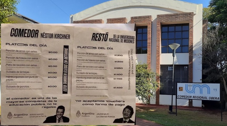En el caso del comedor Néstor Kirchner de la UNAM, en Misiones, colocaron carteles detallando supuestos costos que tendrían los platos del día, mencionando por ejemplo, una porción de arroz con salsa a $1.300 si Milei es electo presidente el próximo 19 de noviembre, contra cero pesos si el actual ministro de economía es el ganador del balotaje electoral.