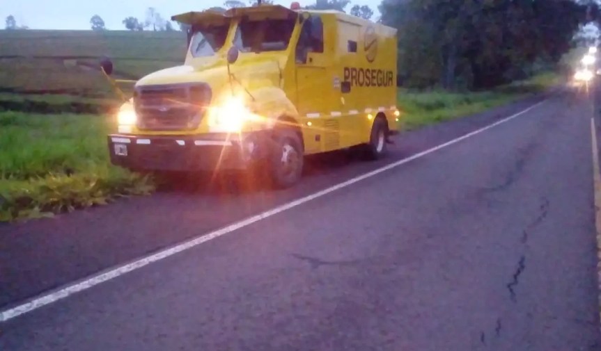 Repentinamente, se abrió la puerta de la cabina de un camión de caudales, y cayó un bolso con dinero al asfalto.