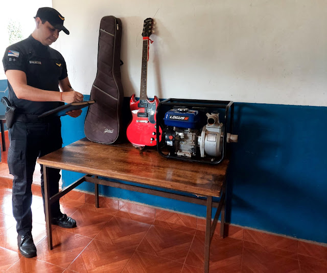 Un hombre de 39 años fue detenido por la policía de Pueblo Illia, acusado de robar una guitarra eléctrica y una motobomba de una vivienda ubicada en el Paraje Saltito 0. El hecho ocurrió hace un mes y fue denunciado por el propietario de los objetos, quien los reconoció al ser recuperados por las autoridades.
