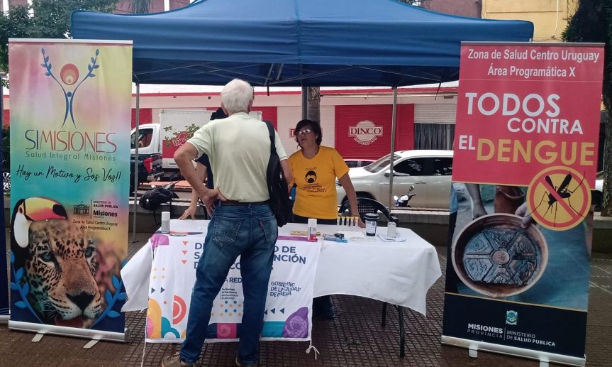 El Ministerio Salud Pública Misiones, a través del Área Programática X de la Dirección Zona Centro Uruguay de Salud, trabajan en forma conjunta con el Área de Salud del Gobierno de la Ciudad de Oberá donde realizan charlas de Concientización y Prevención sobre Dengue en la plaza de los Extranjeros frente al Reloj del Sol, con entregas de folletos, uso del Repelente, limpieza de patios y eliminaron de reservorios de agua y descacharrización.