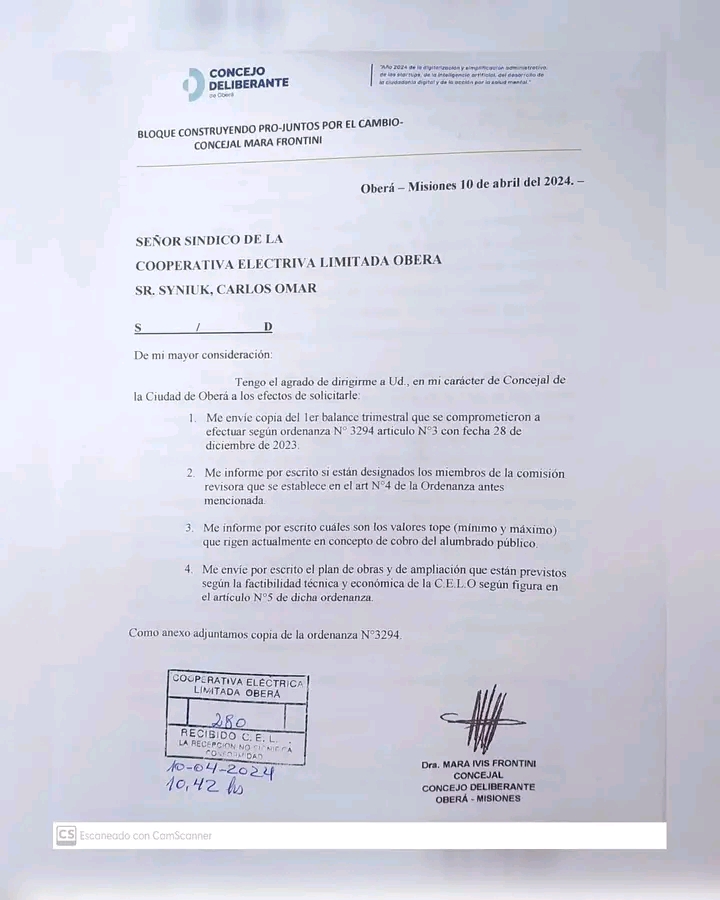 Este miércoles presentó una nota en la C.E.L.O dirigida al síndico, el Sr. Carlos Syniuk pidiendo información por escrito sobre: