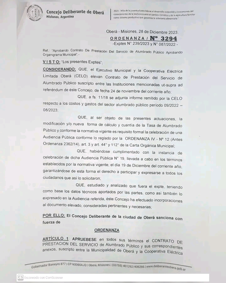 1. Envié copia del BALANCE TRIMESTRAL sobre el cobro de alumbrado público que se comprometieron a efectuar por Ordenanza N°3294 del 28 de diciembre de 2023.