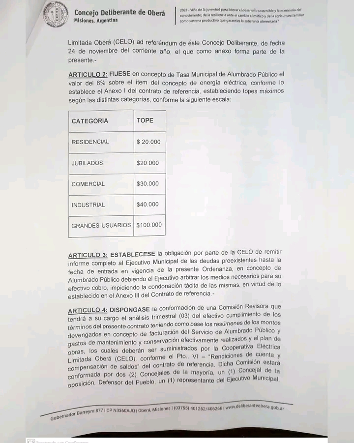 Al respecto, la edil de la oposición planteó que «en tan solo 100 días, ¿AUMENTAN el mínimo de $950,00 a $2.300,00?, y los JUBILADOS ¿le aumentan de $850,00 a $2.00,00?, ¿CUÁL ES EL CRITERIO EN QUE SE BASAN PARA SEMEJANTE AUMENTO?. Son múltiples los reclamos que me llegan de parte de los socios de la cooperativa manifestando IRREGULARIDADES en el cobro del alumbrado público.