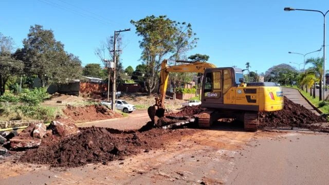El equipo de técnicos, operarios y máquinas municipales avanzan en la reconstrucción del entubado y el asfaltado en avenida De las Américas, que fue destruido por la fuerza de la corriente de agua del arroyo Mbotaby el día del temporal.