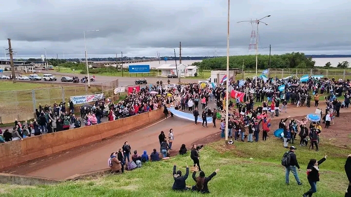 Centenares de docentes de toda la provincia se apostaron en las inmediaciones del Centro de Frontera tras el levantamiento de la Mesa de Negociación Salarial que se reunió hoy en la Escuela Normal Mixta de Posadas.