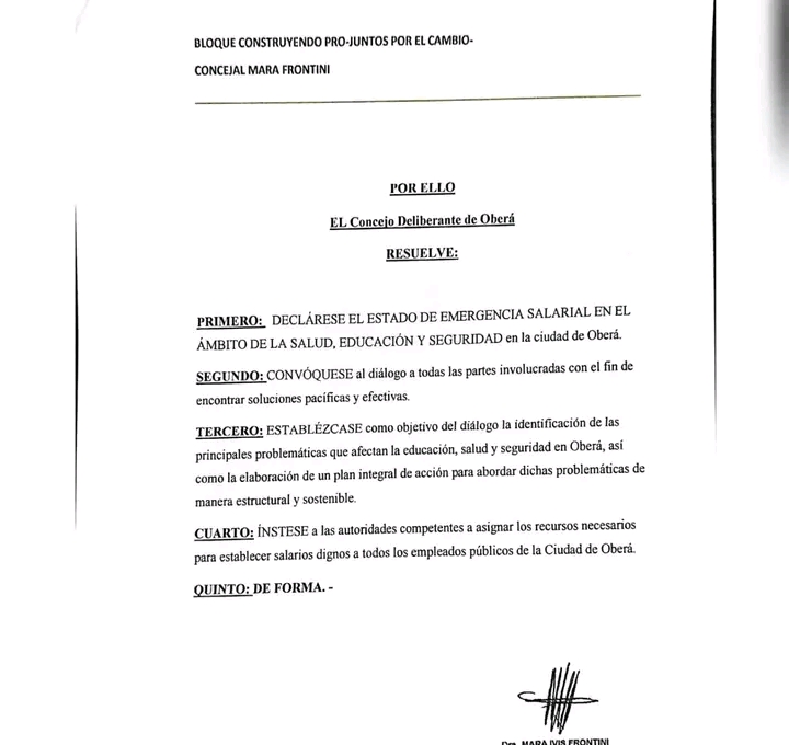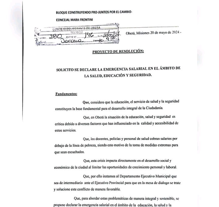 Pido a las autoridades competentes asignar los recursos necesarios para establecer SALARIOS DIGNOS a todos los empleados estatales dentro de la Ciudad de Oberá», fundamentó la edil.