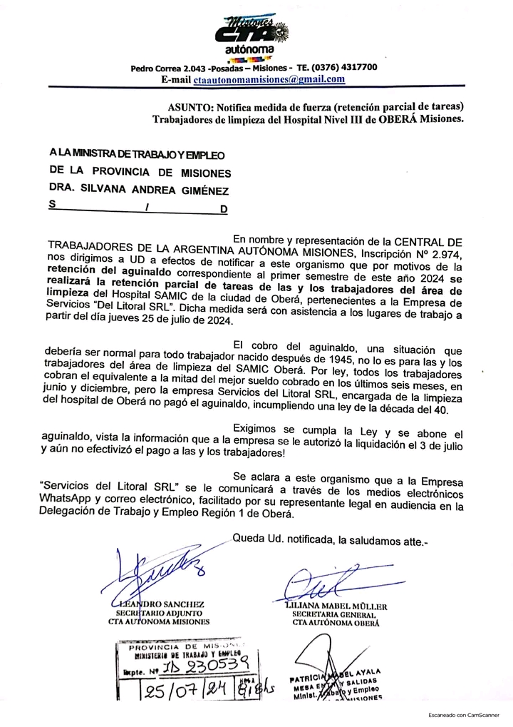 LA CTA Autónoma de Misiones notificó formalmente el inicio de la retención parcial de tareas de las y los trabajadores del área de limpieza del Hospital SAMIC de la ciudad de Oberá.