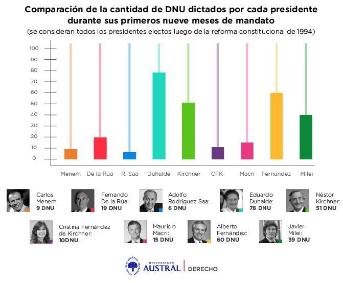 Entre el 10 de diciembre de 2023 y el 10 de septiembre de 2024, Milei dictó un total de 39 DNU, colocándose en el cuarto lugar en la lista histórica, superado por los expresidentes Eduardo Duhalde, Alberto Fernández y Néstor Kirchner, quienes emitieron 78, 60 y 51 DNU respectivamente en sus primeros nueve meses de mandato. Sin embargo, Milei es el presidente de un gobierno no peronista que más DNU dictó en sus primeros 9 meses desde la reforma de 1994, distanciándose de los 19 DNU de Fernando De la Rúa y los 15 de Mauricio Macri.
