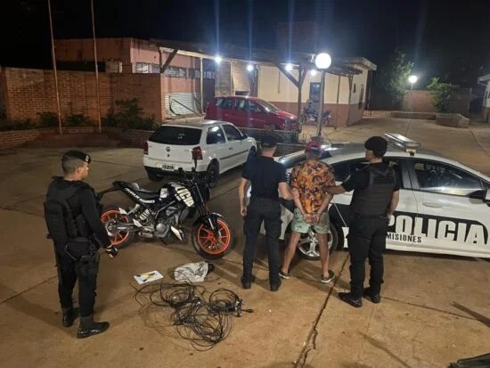 Asimismo, con los datos aportados por vecinos, los efectivos de la comisaría 1ra en conjunto con los agentes motorizados identificaron y detuvieron esta madrugada en la avenida los Inmigrantes y calle Goya a Mauricio D. El mismo, llevaba una mochila que contenía gran cantidad de cables. Cabe mencionar que el detenido posee un frondoso prontuario de delitos contra la propiedad.