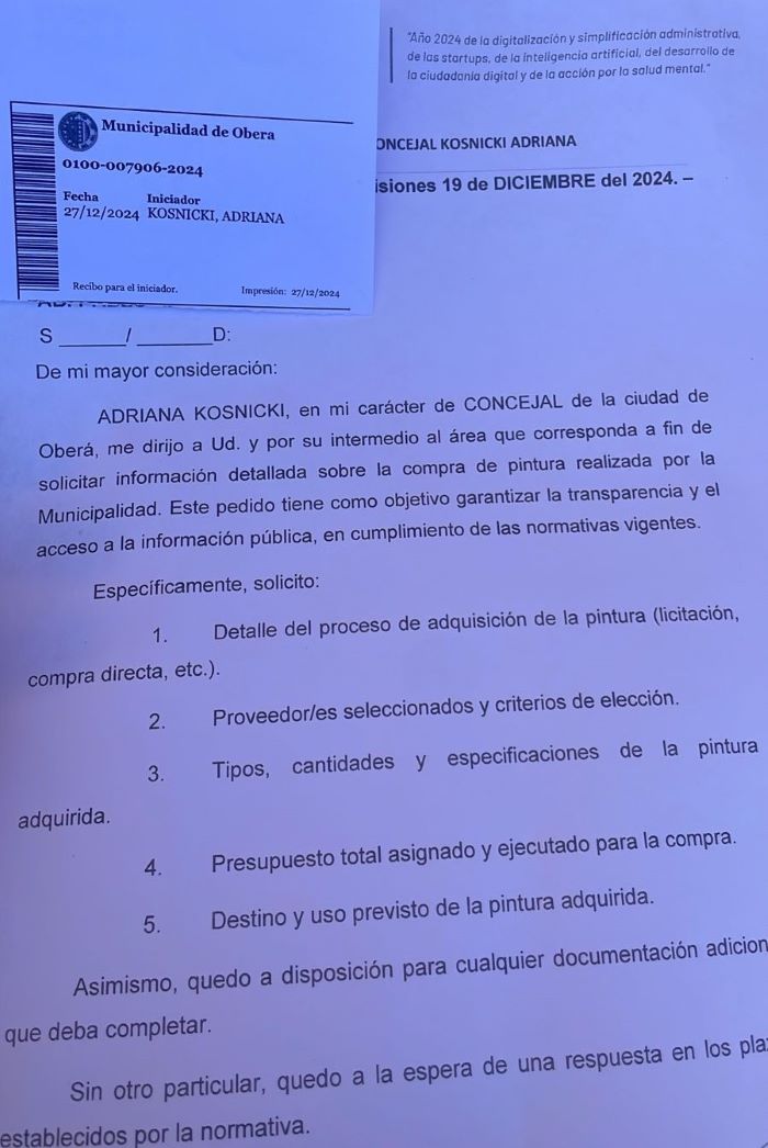 En su rol como concejal de Oberá, Adriana Kosnicki presentó un pedido formal a la Municipalidad para obtener información detallada sobre la adquisición de pintura utilizada en las obras de señalización vial y demarcaciones en la ciudad. Este requerimiento busca garantizar la transparencia en el manejo de los recursos públicos y el cumplimiento de las normativas vigentes sobre acceso a la información.