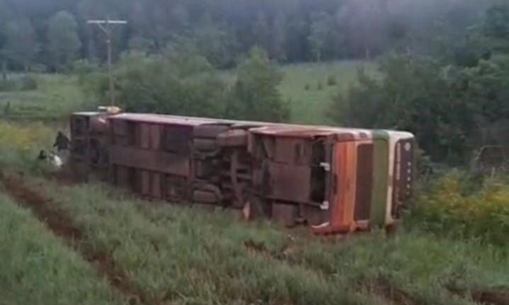 Un colectivo de la empresa Kruse que viajaba desde Comandante Andresito hacia Posadas volcó en la mañana de este lunes en el kilómetro 1482 de la Ruta Nacional 12, en jurisdicción de Garuhapé