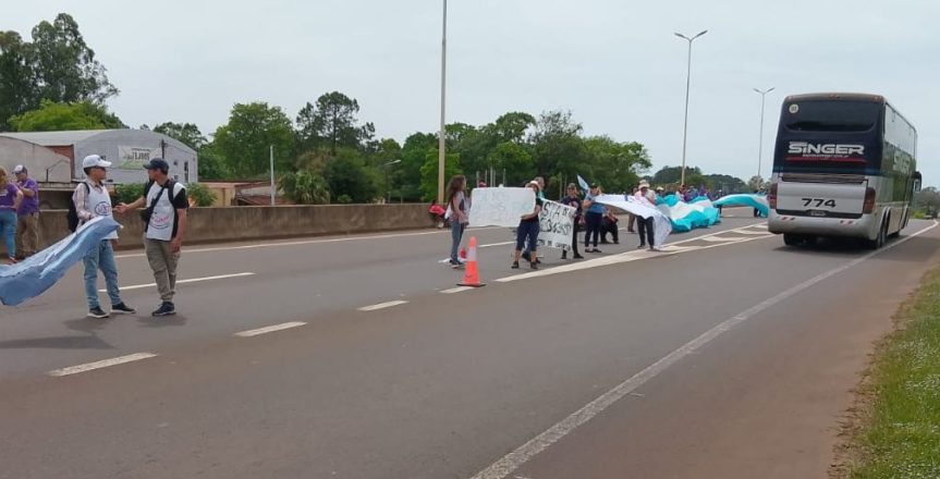 En el marco del paro de 24 horas convocado por el FTEL, docentes cortaron media calzada de la autopista a la altura de Candelaria, exigiendo recomposición salarial, devolución de los descuentos por días de paro y absolución de los referentes de la CTA Autónoma, Mónica Gurina (secretaria general) y Leandro Sánchez (secretario adjunto)