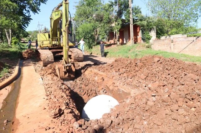 Personal de la municipalidad de Oberá ejecuta el entubado de la calle Francia, en el barrio Stemberg, con el objetivo de optimizar el drenaje pluvial.