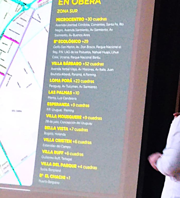 Macías, que desde diciembre será el presidente de la Legislatura misionera en reemplazo de Oscar Herrera Ahuad, detalló mediante gráficos que las obras se dividirán en microcentro: 30 cuadras; barrio Ecológico 29 cuadras; Bárbaro 52 cuadras; Loma Porá 23; Las Palmas 10; Esperanza 9; Mousquere 9; Bella Vista 7; Cristen 6; Ruff 6; Villa del Parque 4; Chachí 1; etc.