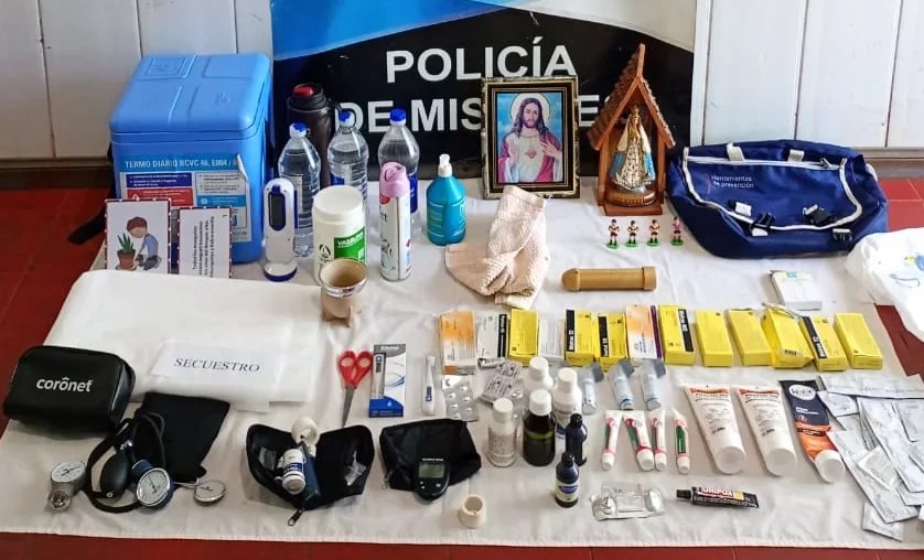 En cercanías de una estructura precaria donde se ocultaba, los investigadores hallaron entre las malezas una gran cantidad de objetos que coincidían con los denunciados en ambos hechos. Allí se secuestraron herramientas, indumentaria, llaves, insumos médicos, medicamentos, tensiómetros, termómetros, jarabes, preservativos, folletos sanitarios, artículos de higiene, una imagen de la Virgen de Itatí, una conservadora, un termo, un mate y otros elementos.