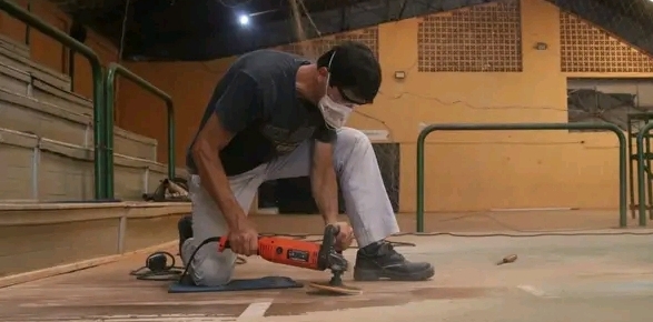 El Gobierno de la Ciudad de Oberá lleva adelante el plan de mejoras y obras de mantenimiento en el gimnasio N°1 del Ian Barney. Lijado profundo, limpieza profunda de la superficie y finalmente se pintará..