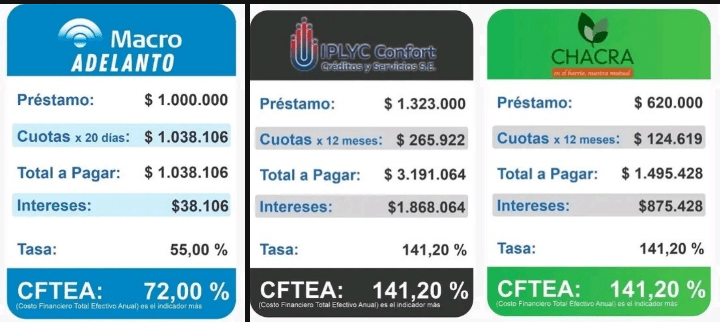 La comparación incluye cuatro préstamos. Dos pertenecen al Banco Macro. Dos a entidades que operan con empleados públicos. Iplyc Confort y la mutual La Chacra.