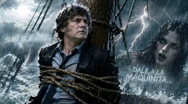 La foto, publicada en su cuenta de Instagram, lo muestra atado al mástil de un barco que se encuentra en medio de una tormenta. A su alrededor, un grupo de sirenas le dicen frases como: «subí el gasto», «emití», «aflojá» y «dale a la maquinita».