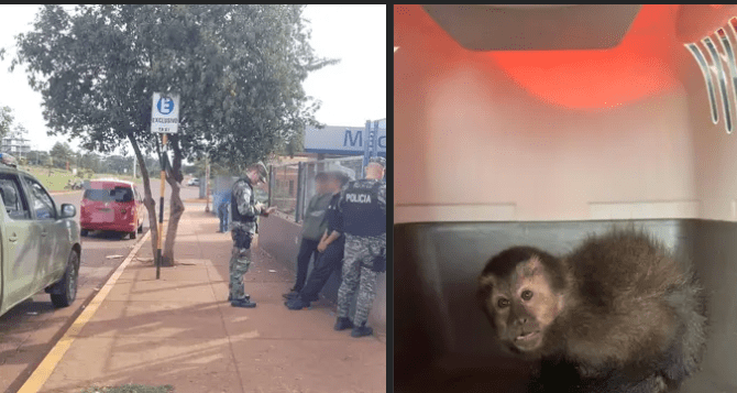 Durante la intervención, los uniformados constataron que los involucrados transportaban en una caja de cartón un primate macho de la especie Sapajus apella, conocido comúnmente como mono caí. De inmediato, procedieron al rescate del animal, además del secuestro de una motocicleta IMSA de 150 cc.